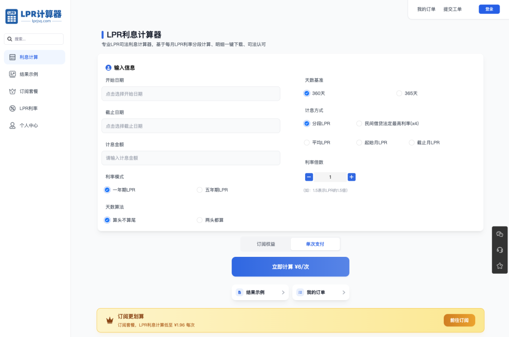 专业计算诉讼、仲裁或合同纠纷中基于LPR(贷款市场报价利率)的债务利息、逾期付款违约金或损失。本工具支持按历史LPR利率自动分段计算利息